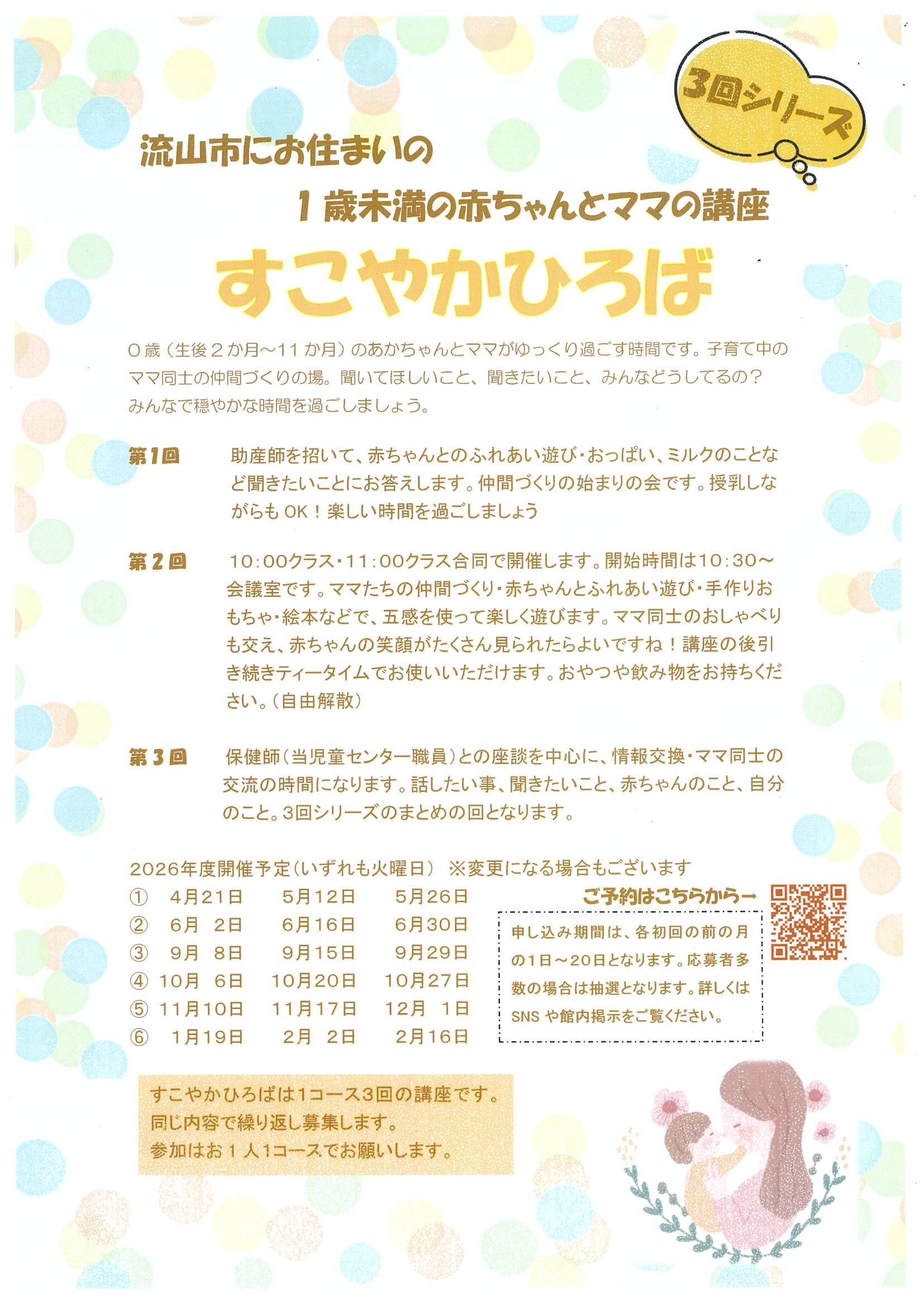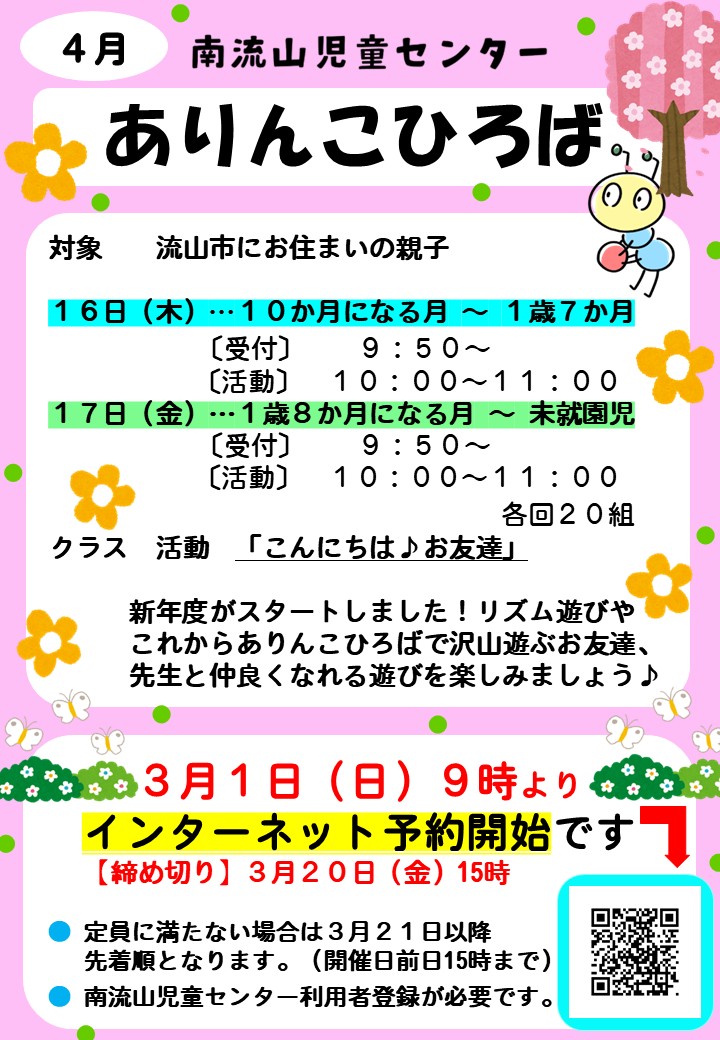 「ありんこひろば」「すこやかひろば」は「講座参加申込(流山市在住者対象)」のページをご覧下さい。