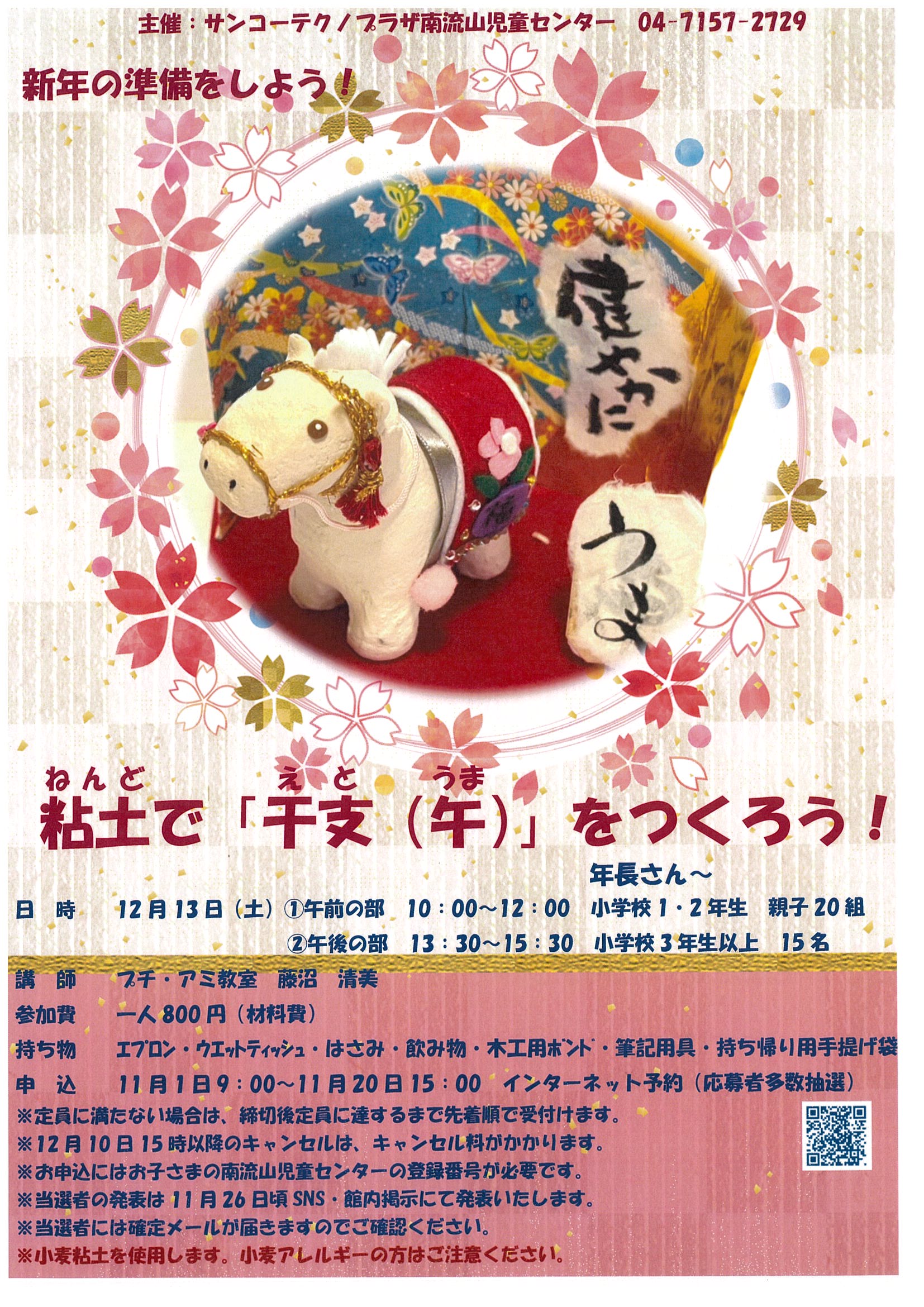 12月13日(土)開催の「粘土で干支(午)を作ろう!」の講座(午前の部)が、ご要望により年長さんから参加が可能となりました。