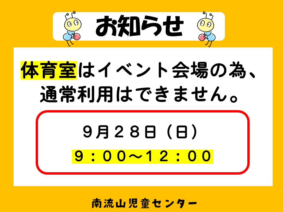 9月28日(日)9:00~12:00は、イベント会場となる為、体育室は通常利用ができません。
