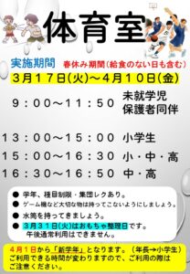【体育室】3月17日(火)~4月10日(金)は春休み期間となります。