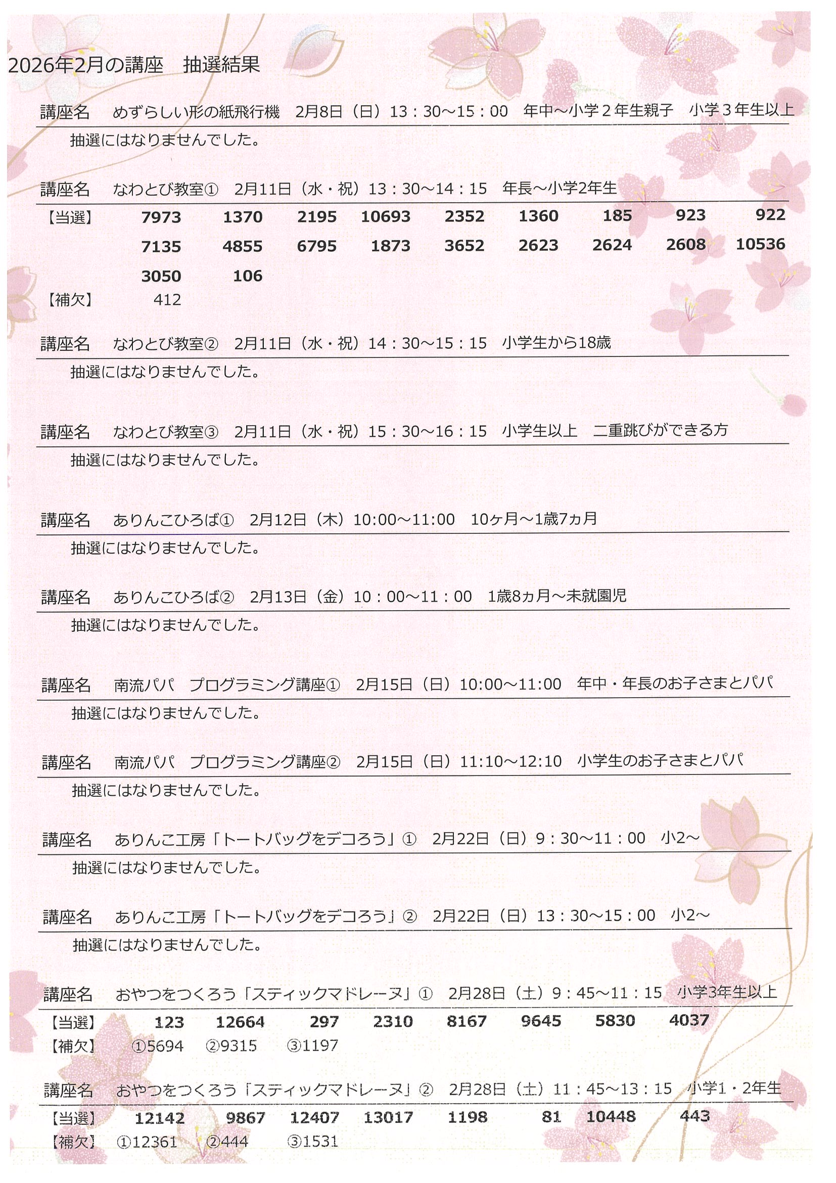 2月講座の抽選結果について