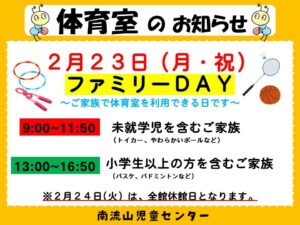 ファミリーDAYは、ご家族で体育室を利用できる日です。