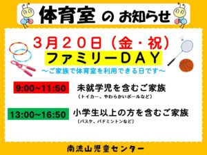 ファミリーDAYは、ご家族で体育室を利用できる日です。