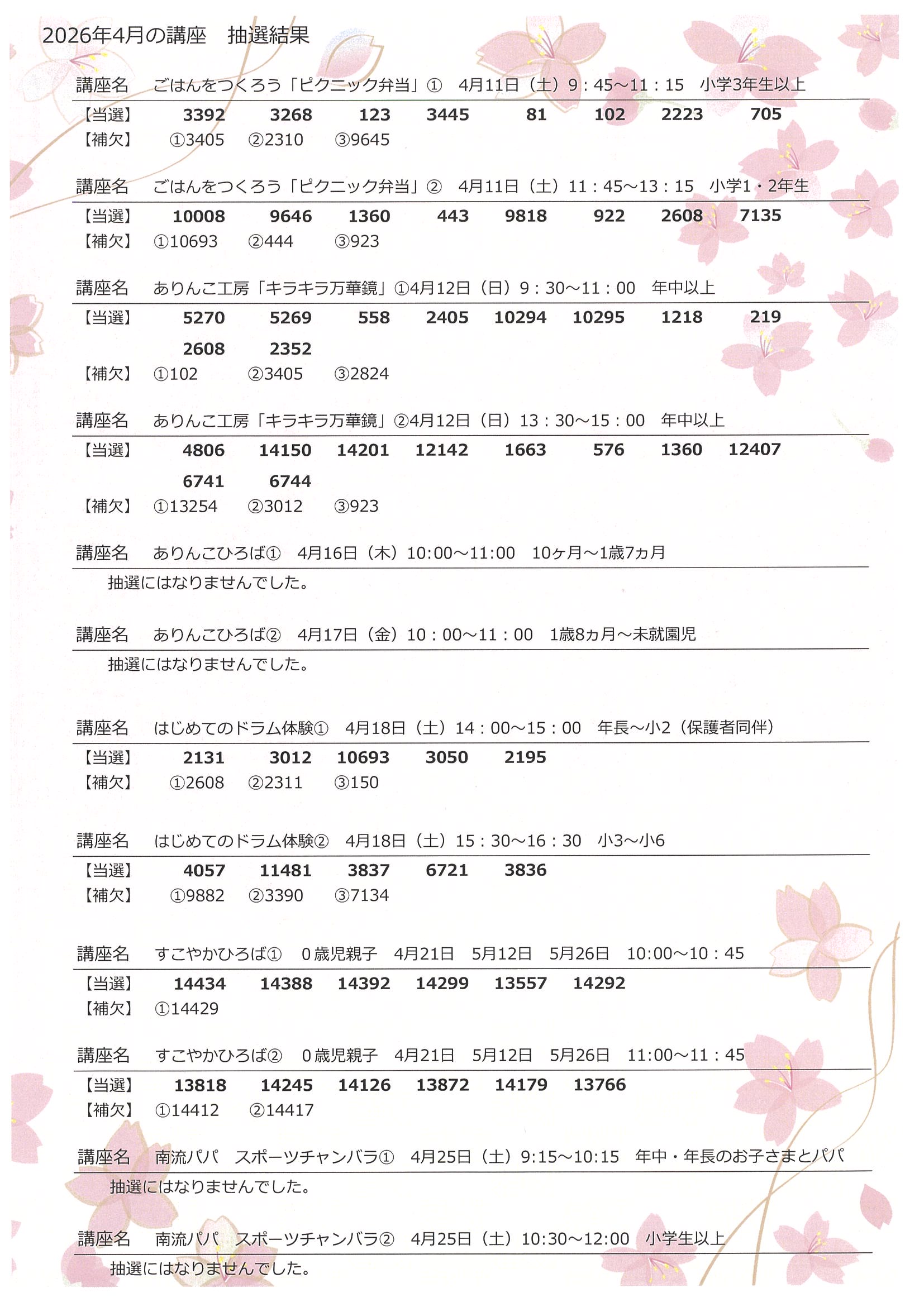 4月講座の抽選結果について