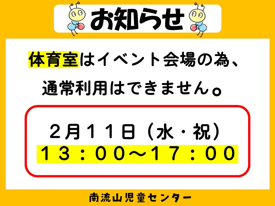 2月11日(水・祝)13:00~17:00は、イベント会場となる為、体育室は通常利用ができません。 ご利用の際はご注意ください。