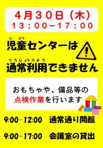4月30日の午後に、おもちゃの整理を行うため、通常利用ができません。